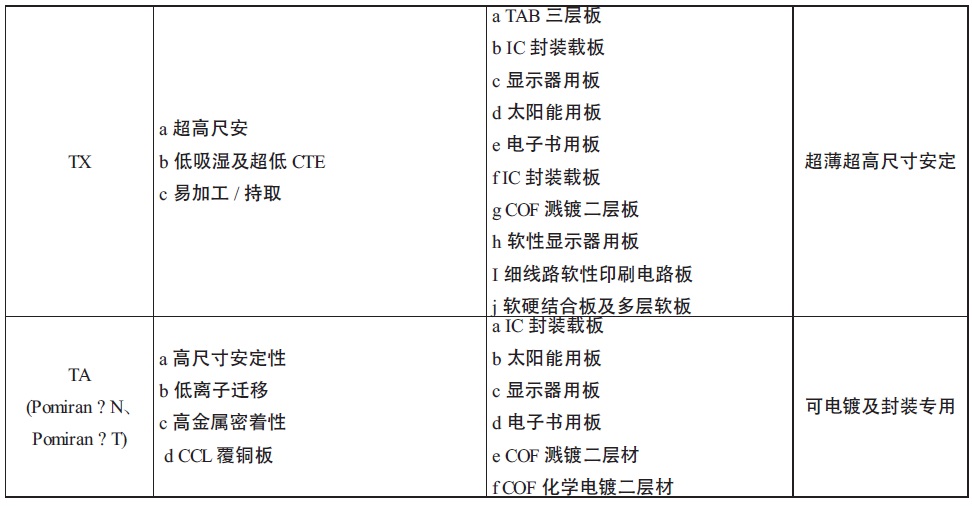 2009 年**家推出白胶涂覆型的白色聚酰亚胺(PI)膜,2010 年首度推出高性能非涂覆型的第二代高性能材料白色PI 膜(型号为WB)。为解决高温环境造成材料劣化变色、LED 强度的快速衰退及颜色偏移问题,达迈科技也提供了对应的材料型号为“TC”的散热型PI。达迈量产的黑色PI“BK”通过台湾柔性覆铜层压板(FCCL)厂商台虹科技和柔性基板厂商台郡科技采购的得到了“iPhone”的采用,具体的产品特点及应用详见下表。